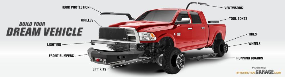 If you've ever thought: What would that part would look like on my truck? Interactive Garage provides a realtime display of exactly how these parts would look on your vehicle. Find the perfect balance between style and affordability or just go all out. Want to come back and make edits? Create an account and save the build in "My Garage" or print off what you have so far for later.